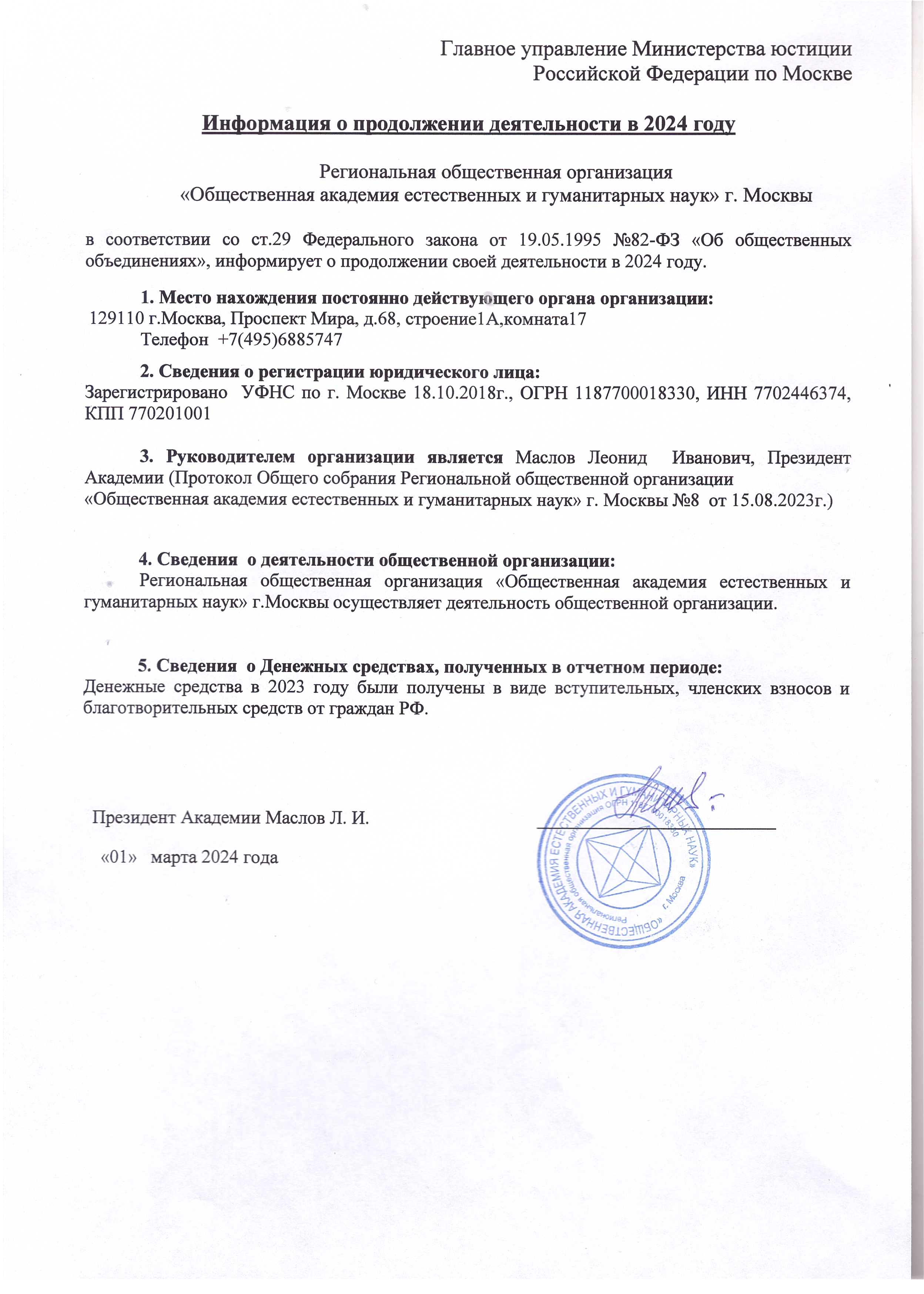 Иформация о продолжении деятельности в 2024 г.01.03.2024